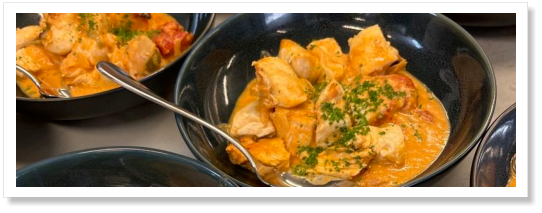 Salade de carotte coco et avocat, carpaccio de poisson à la mangue et vanille de Madagascar, beignets de thon à l'ivoirienne, velouté de patate douce aux crevettes, bœuf Mafé, poulet sauce cacahuètes, poulet DG (aux légumes sautés), bananes plantain, épinards aux cacahuètes, riz